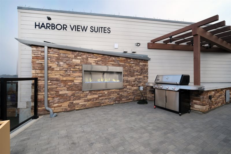 - Outdoor community BBQ area with fireplace and bay views with plenty of seating to gather or dine together.