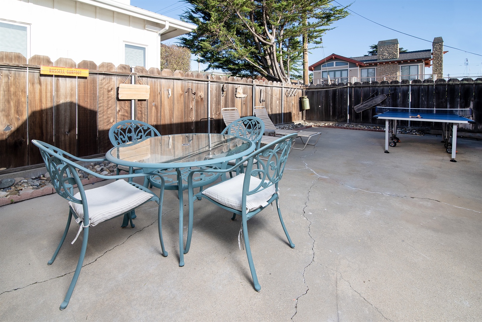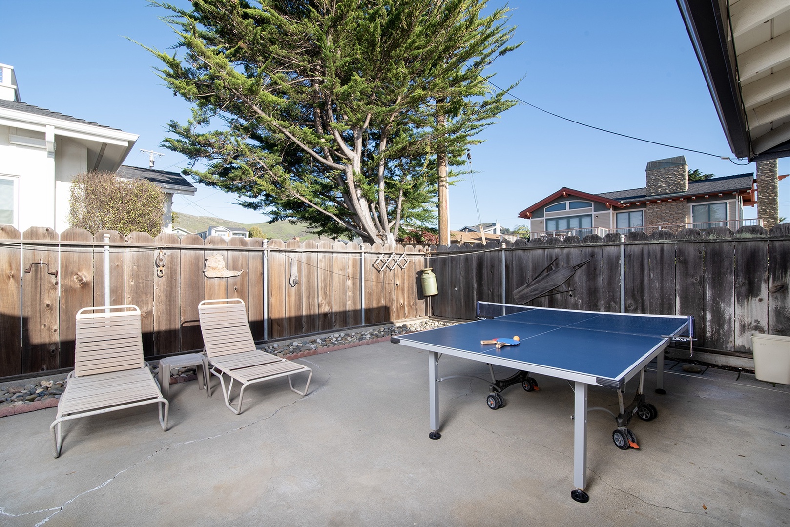 Back patio with ping-pong table, dining table, and lounge chairs.