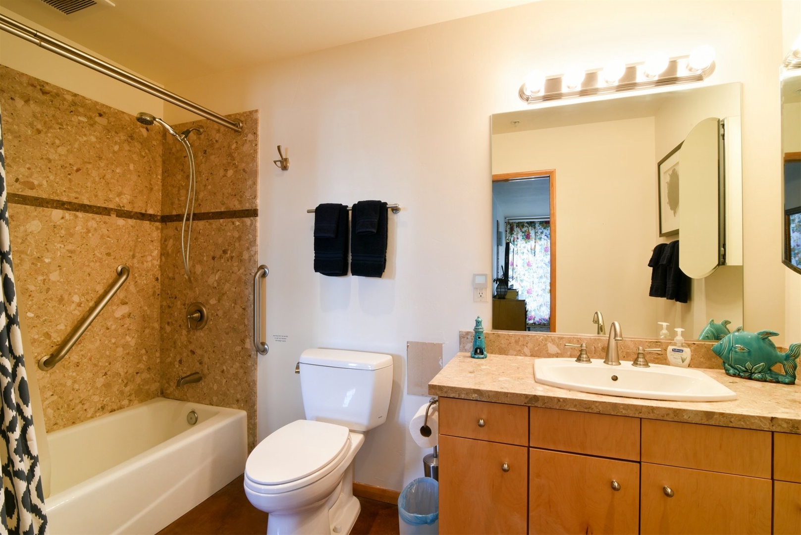 The bathroom connects to both bedrooms and has a shower and tub combo