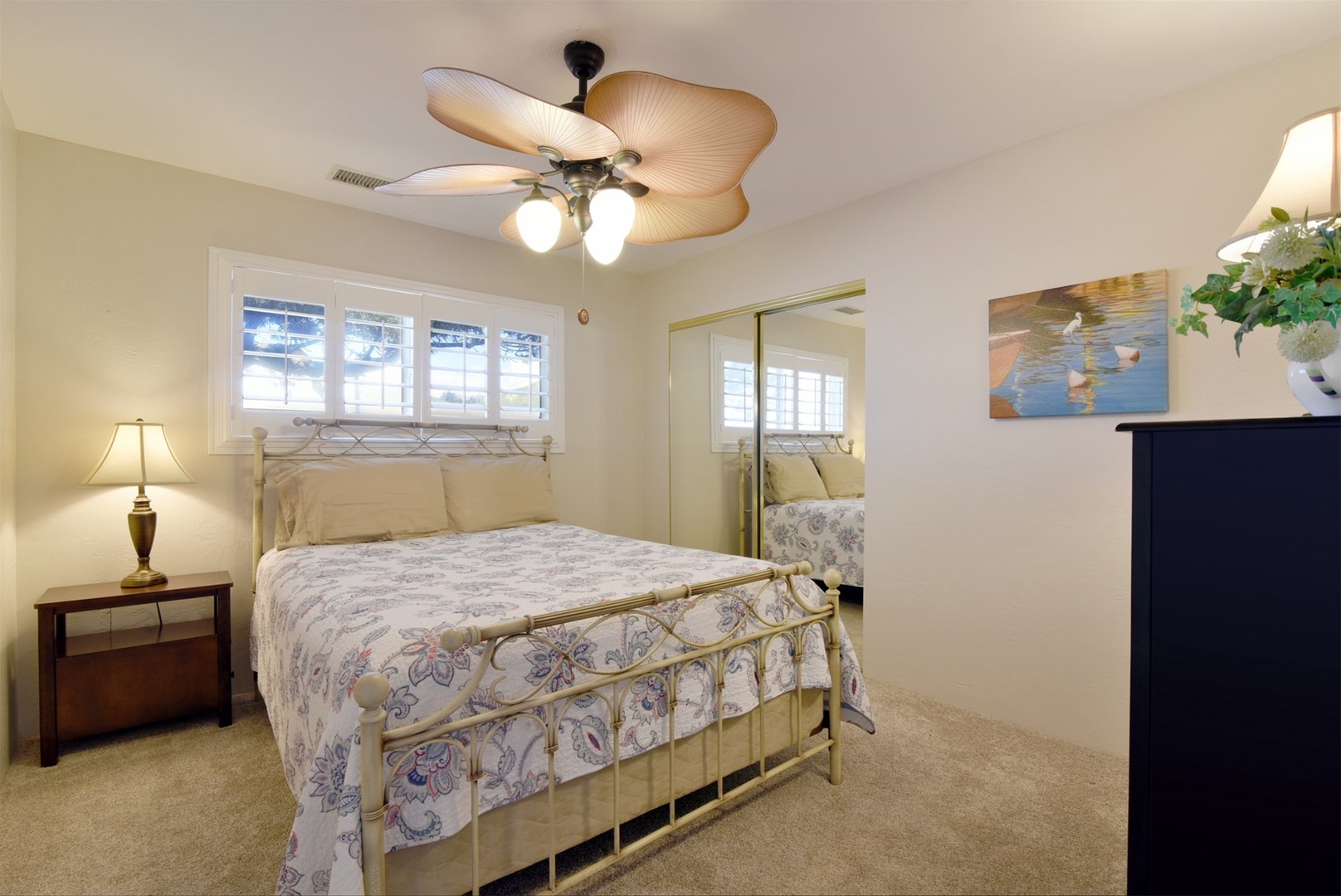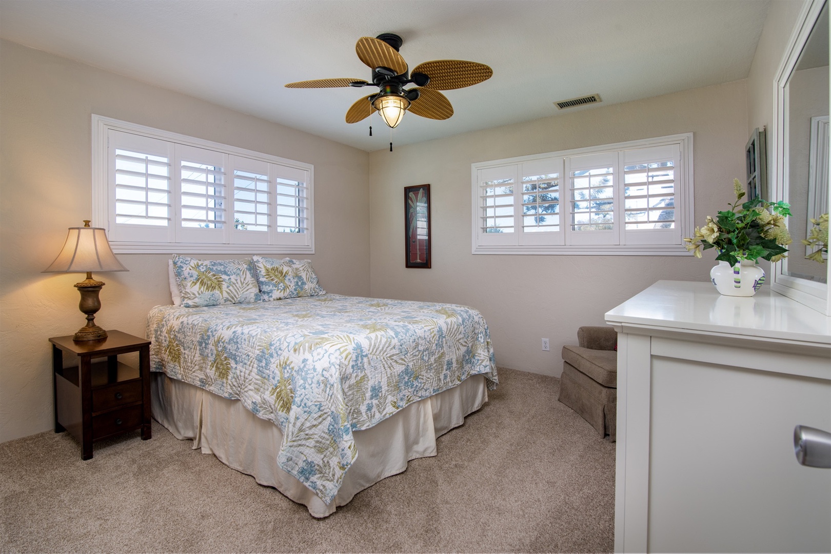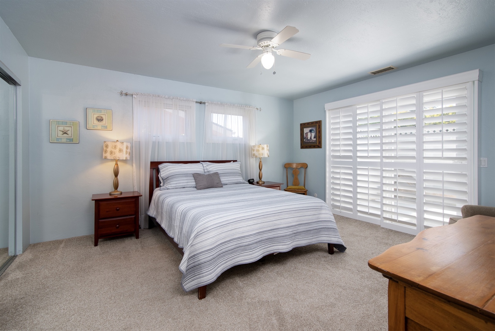 • The master bedroom has a queen bed, an adjoining bathroom with a step in shower, and a private patio area.