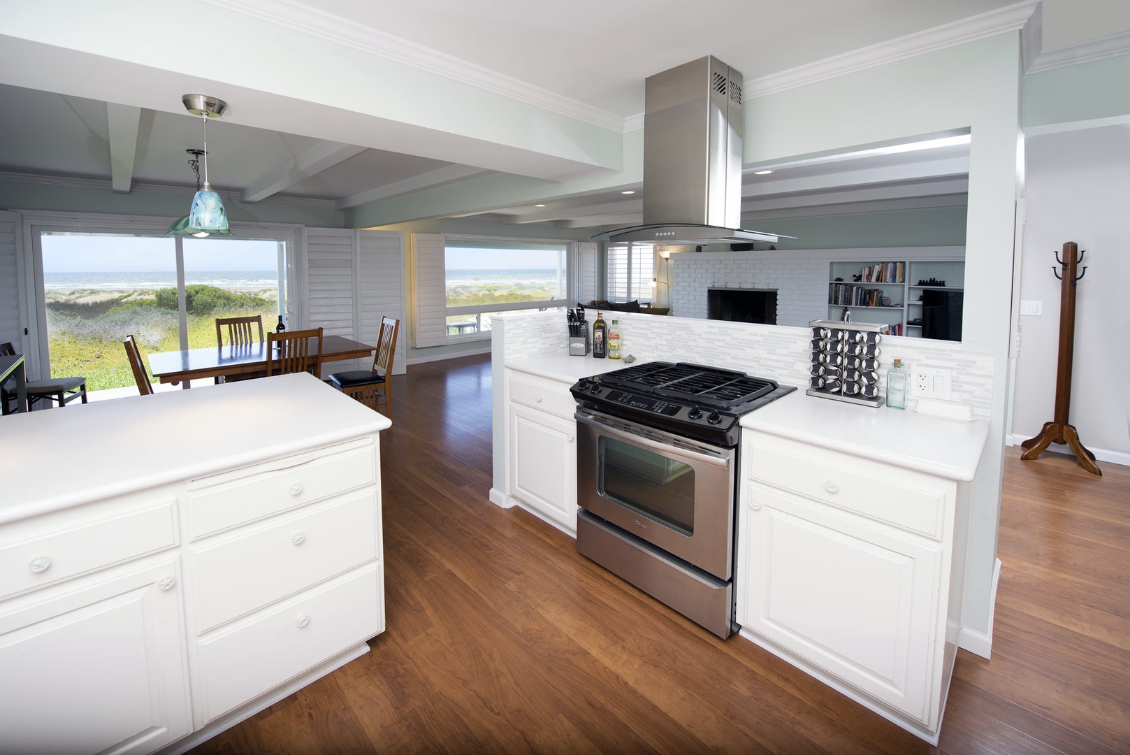 • The living room, dining room and kitchen are one large, open area with Amazing ocean views to hang out in.