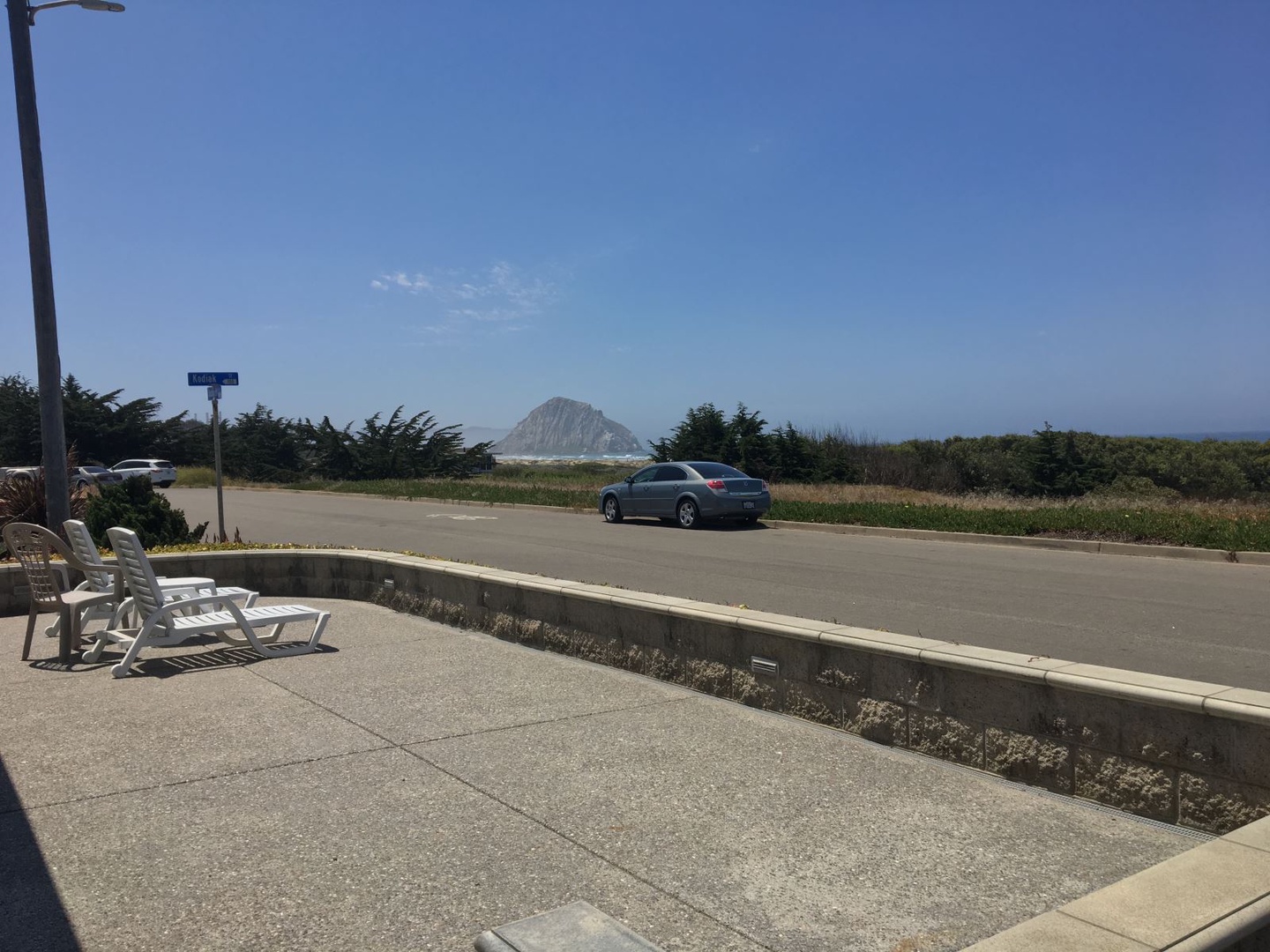 An outdoor table on the oceanfront patio overlooks the Morro Strand Beach