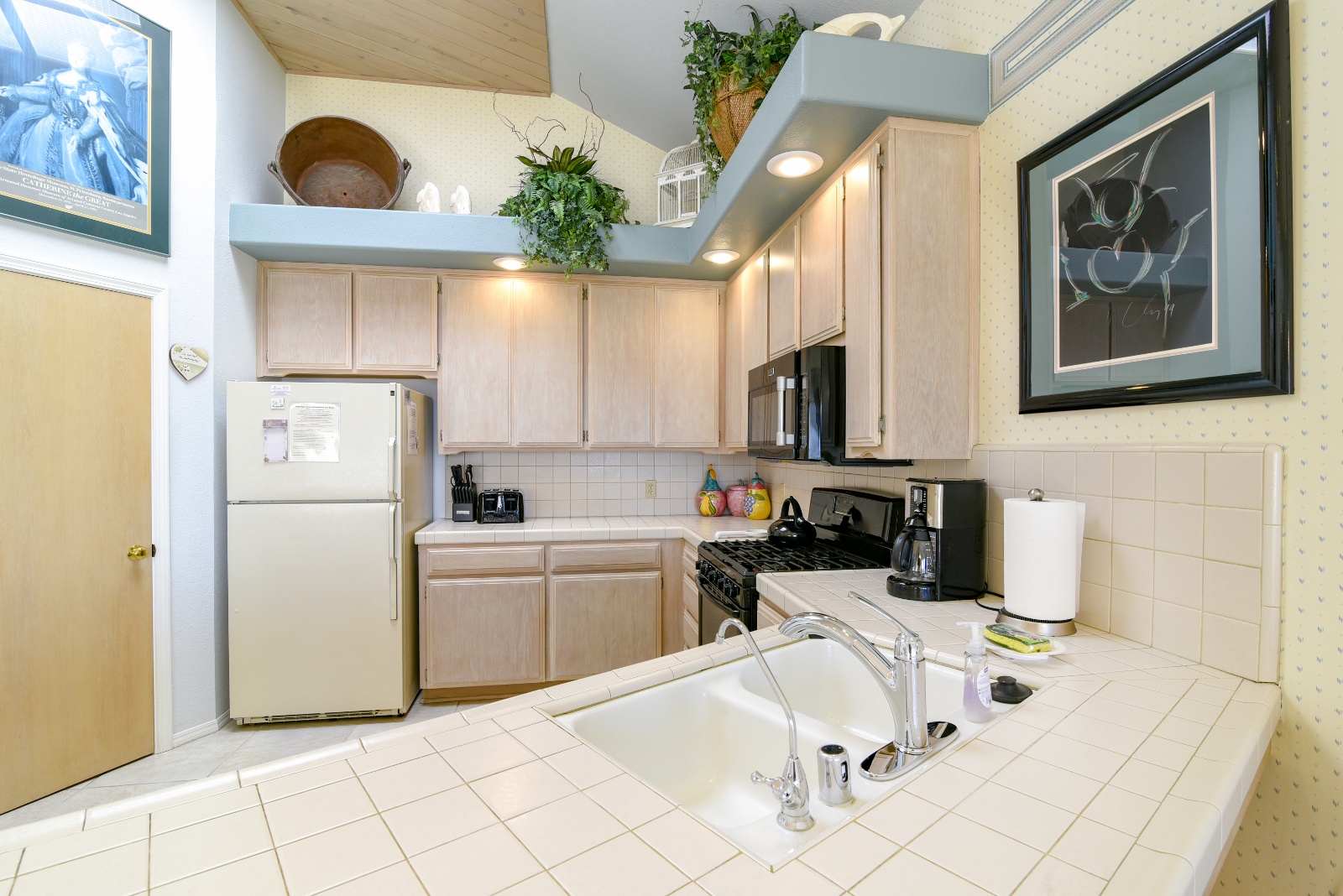 The kitchen offers a large counter space for prepping meals and a pantry for food storage