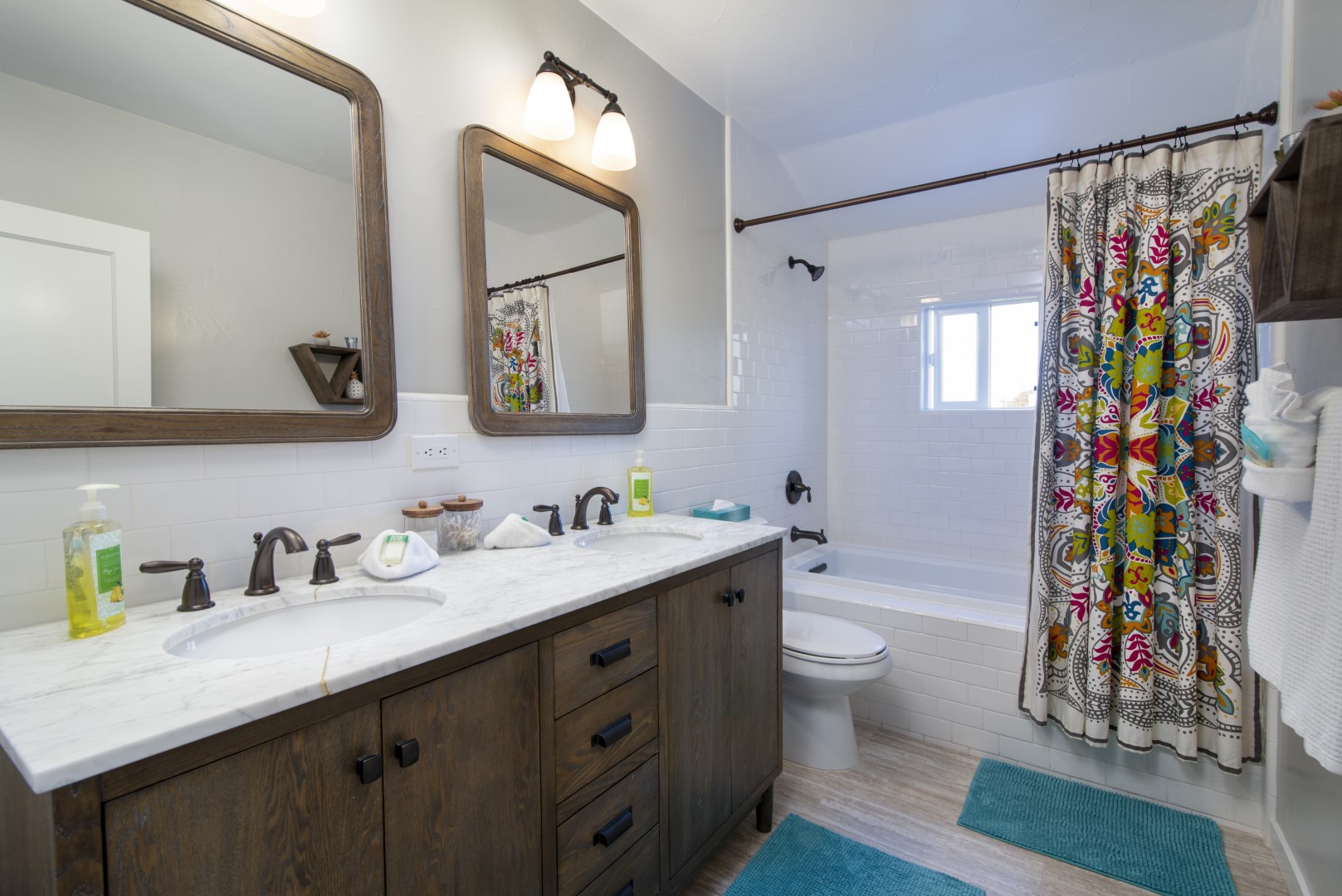 • Hall Bath with combination shower/tub and dual vanities (note there is only 1 bathroom in this home)