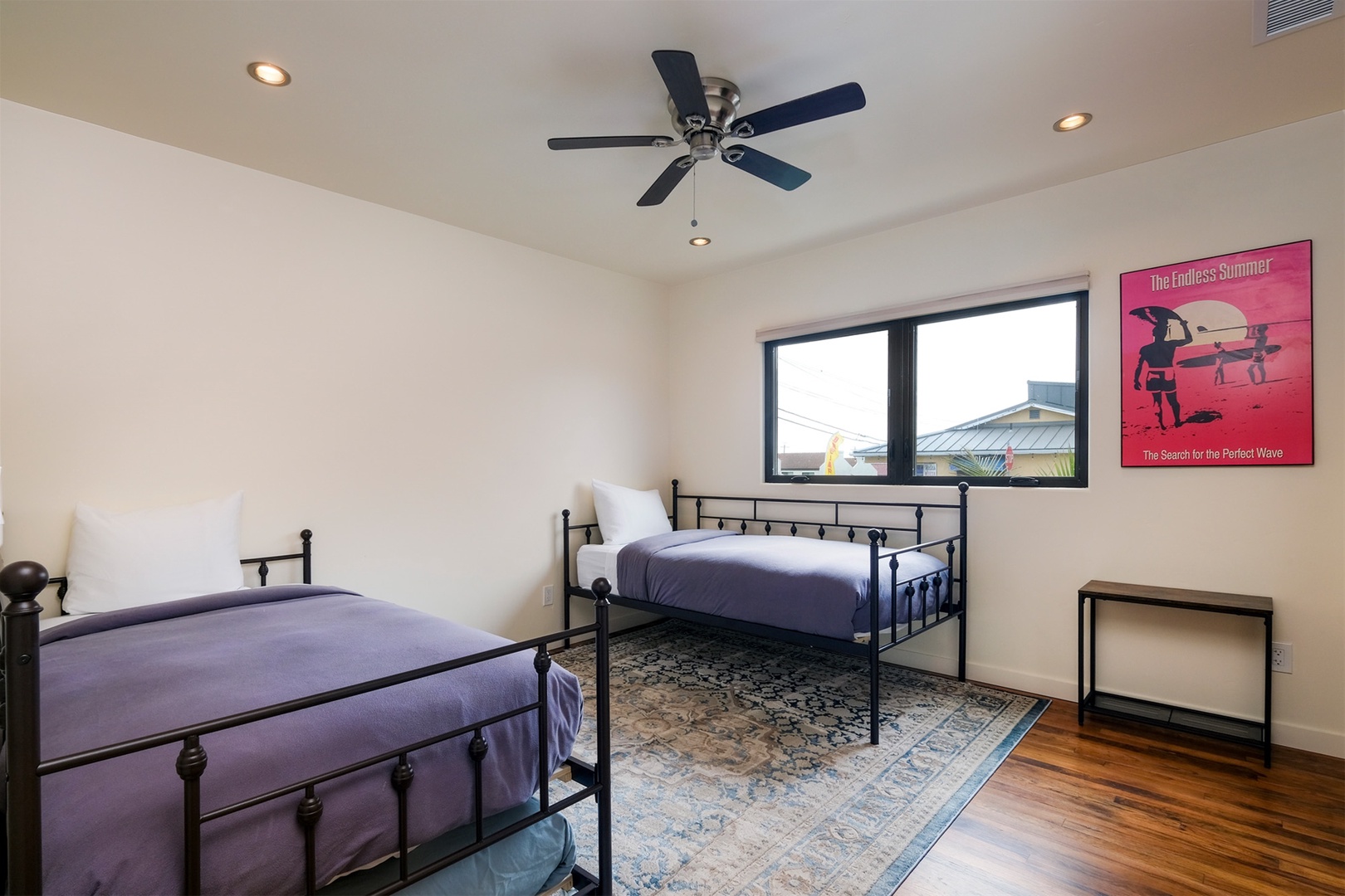 • A third bedroom includes a twin bed and a twin trundle, three twin beds in total.