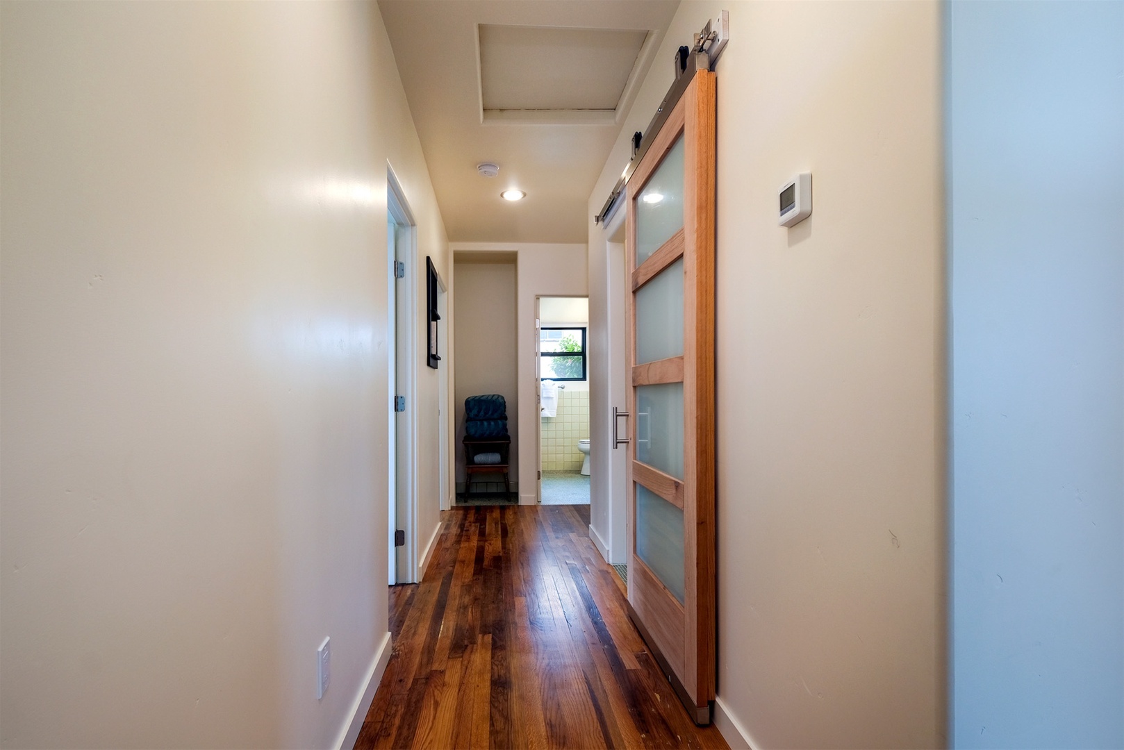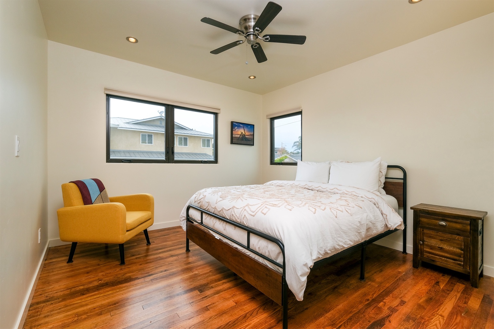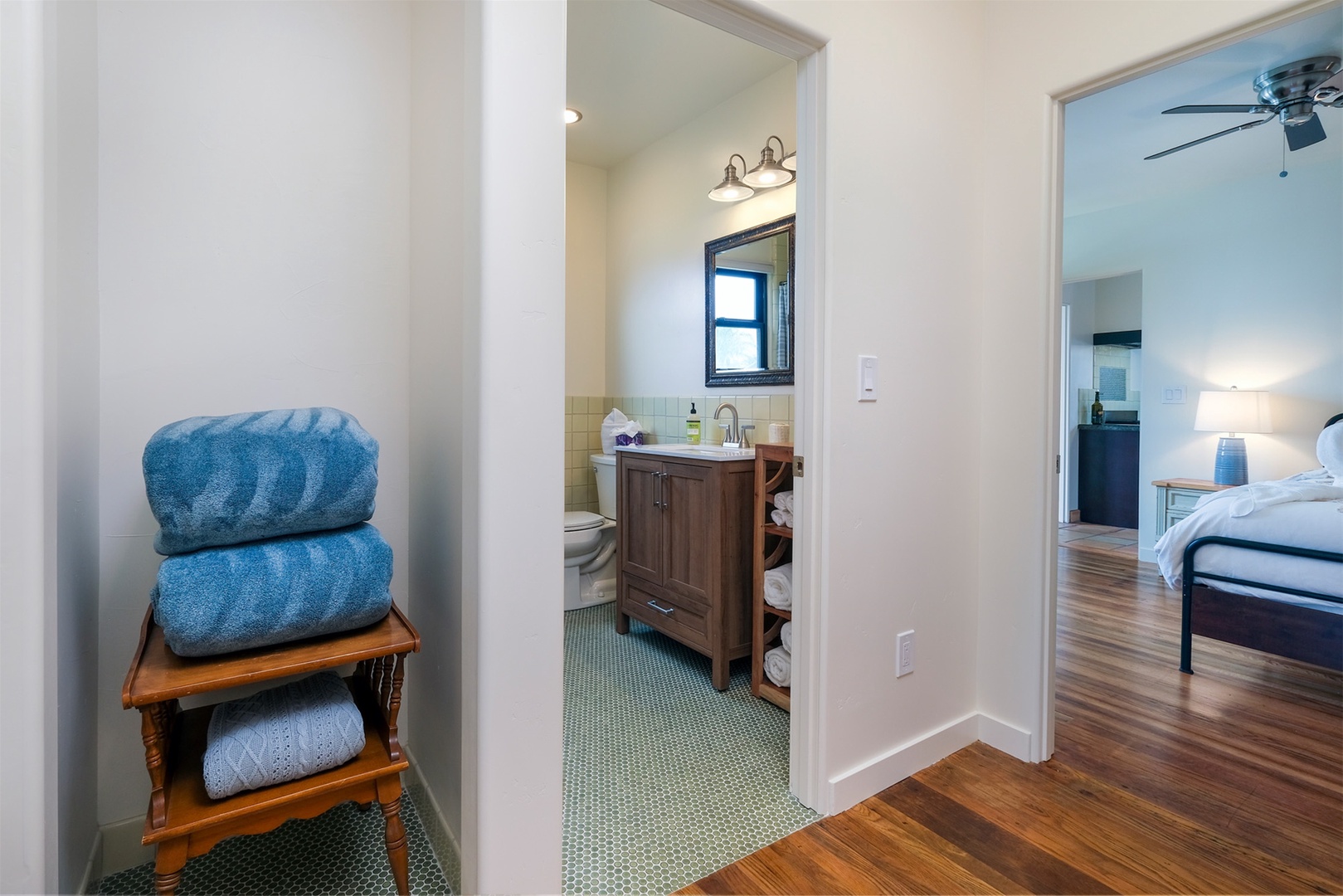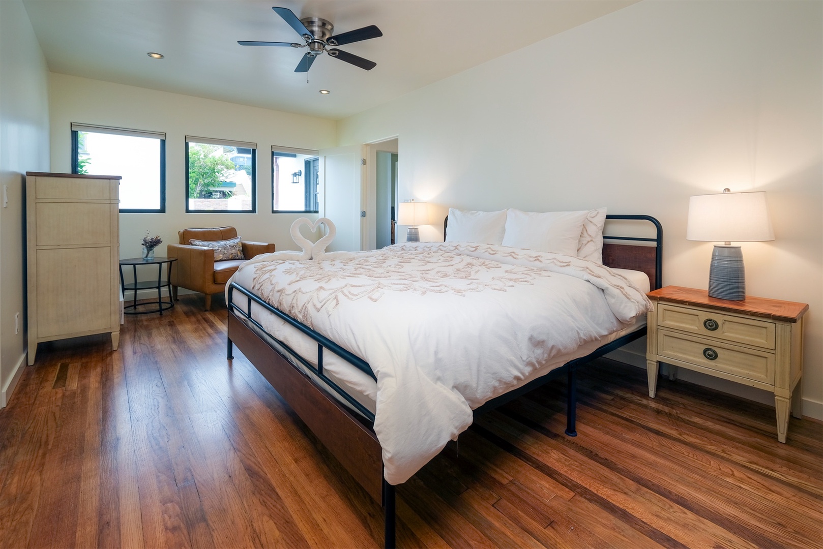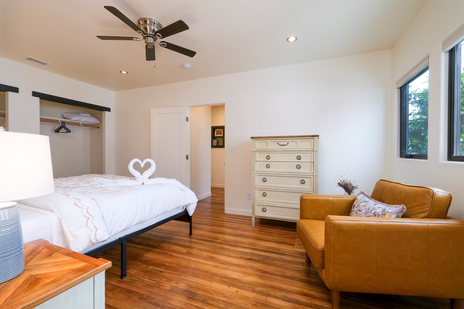 • Spacious primary bedroom includes a king size bed and can be accessed from the hallway or kitchen area