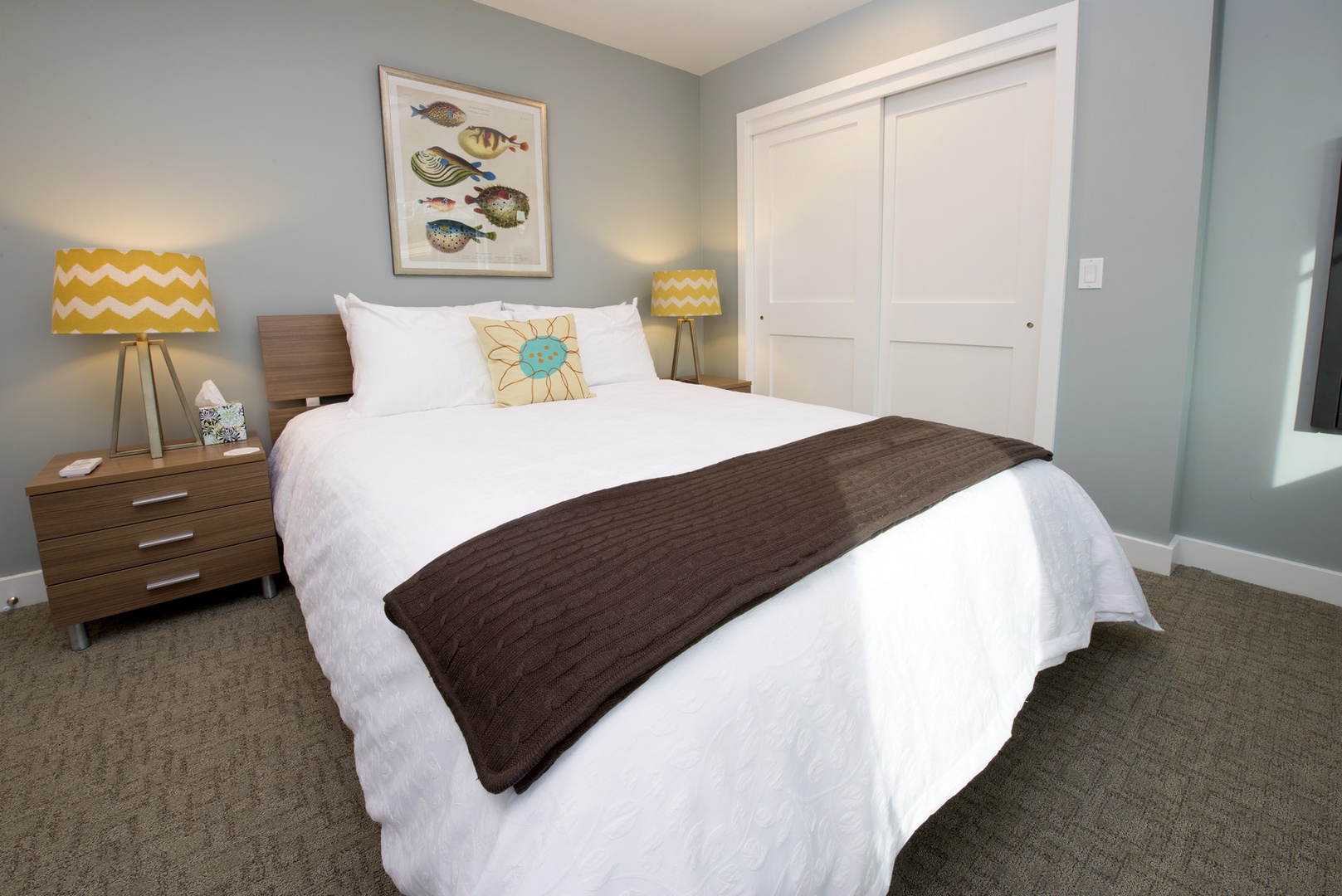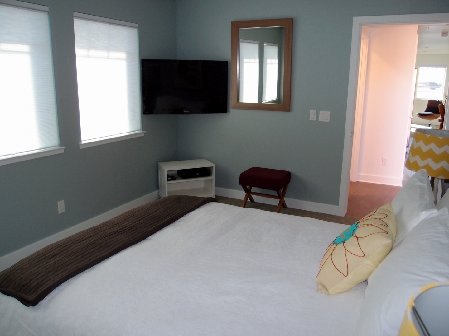 • The bedroom has a queen-size bed, a large flat-screen TV and plenty of closet space.