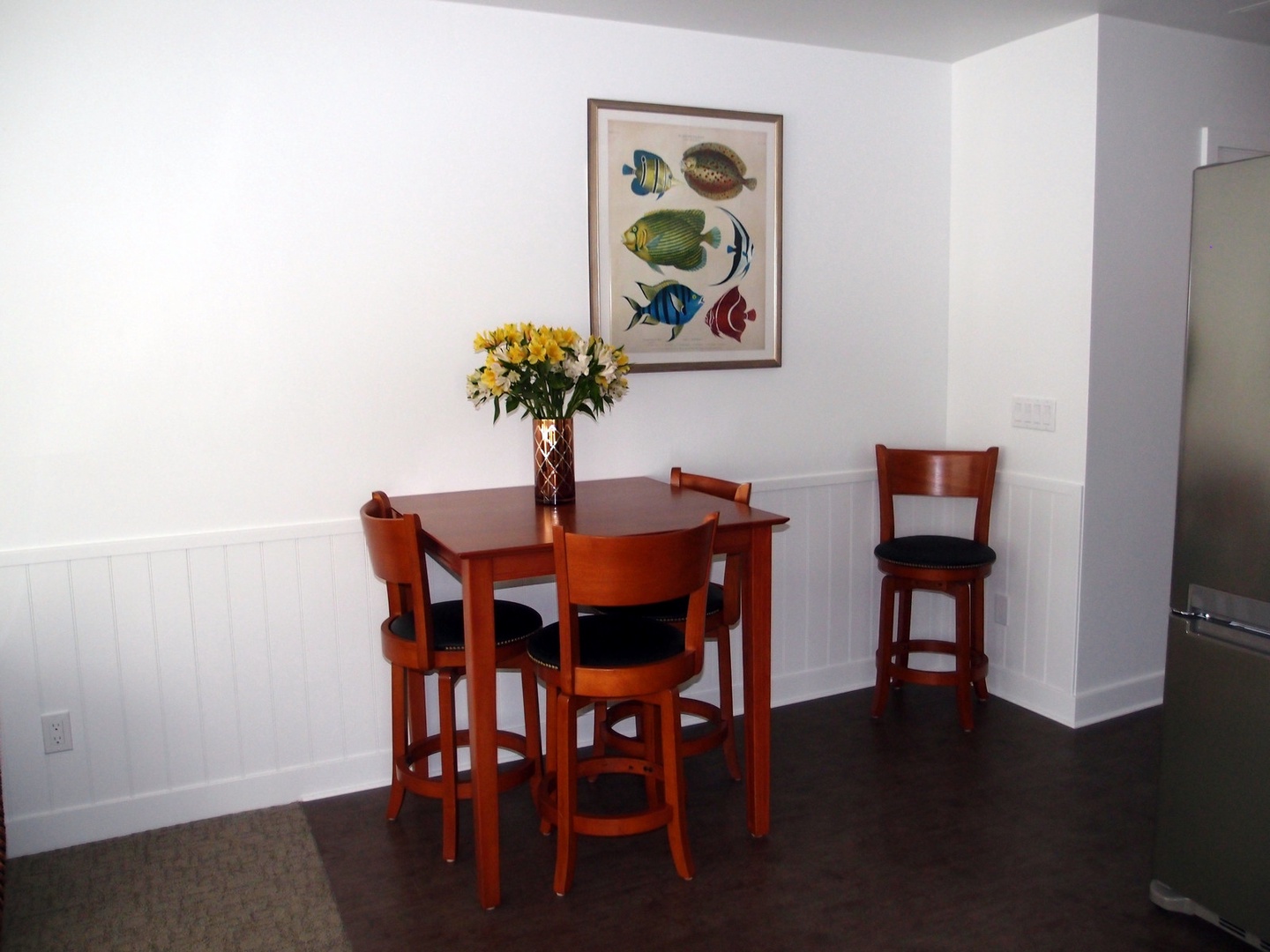 The dining area offers seating for 4 and is adjacent to the living room and kitchen.