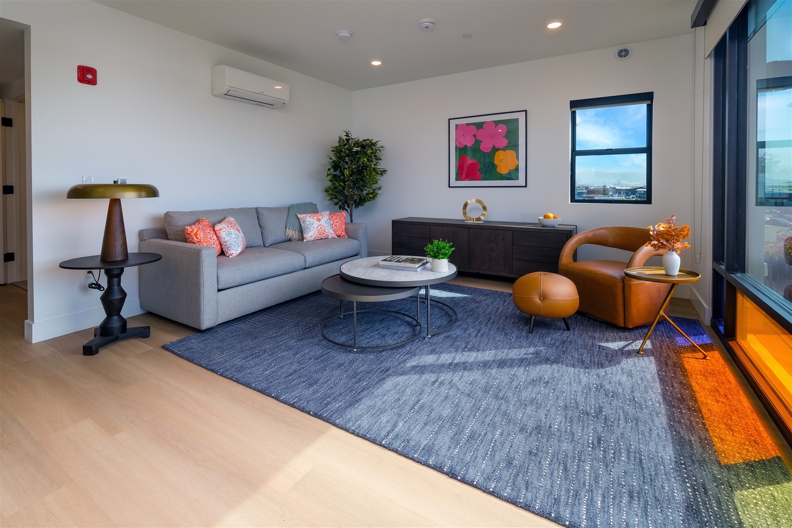 Enjoy light pouring through avant-garde windows in living room and kitchen spaces