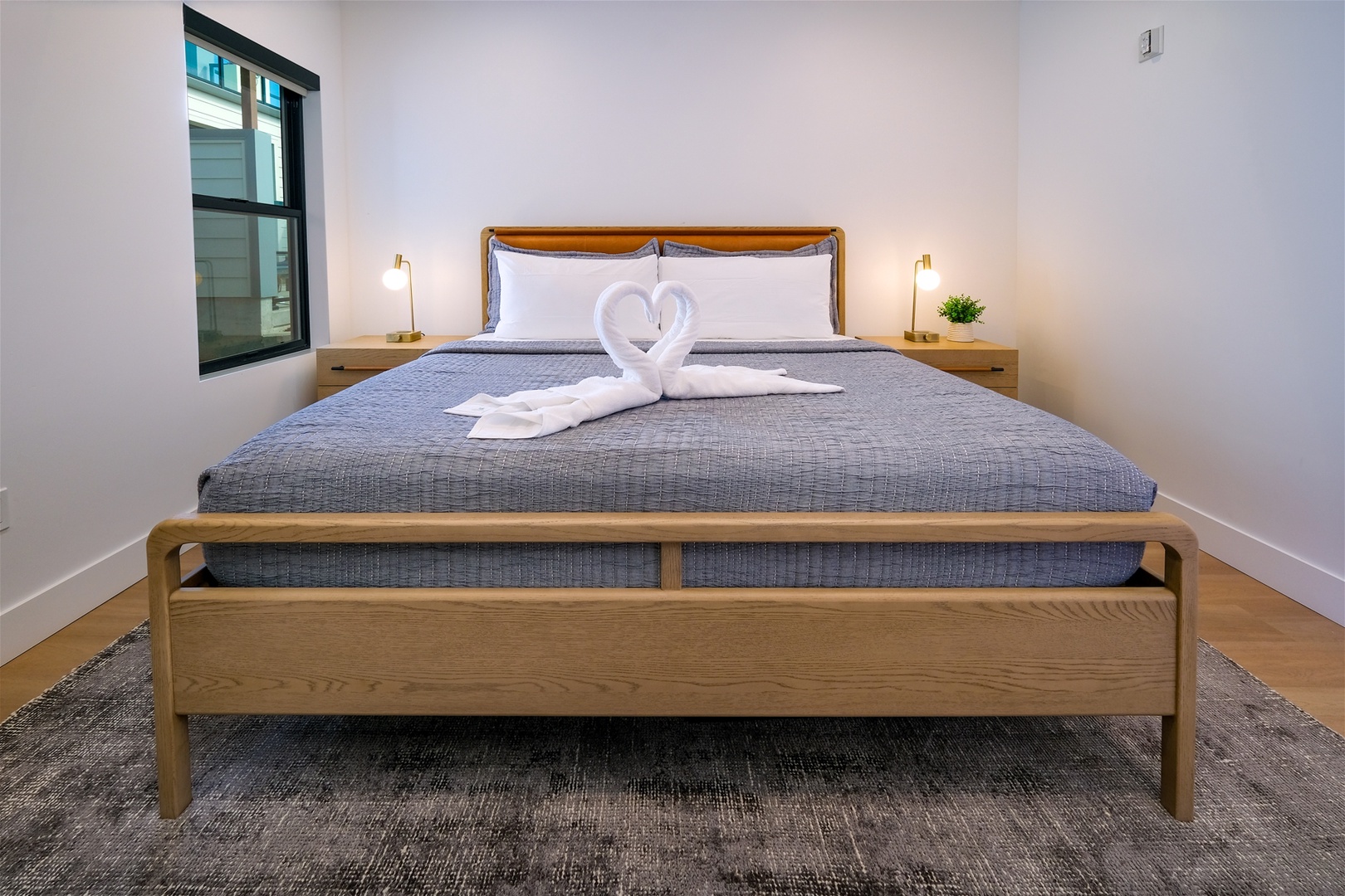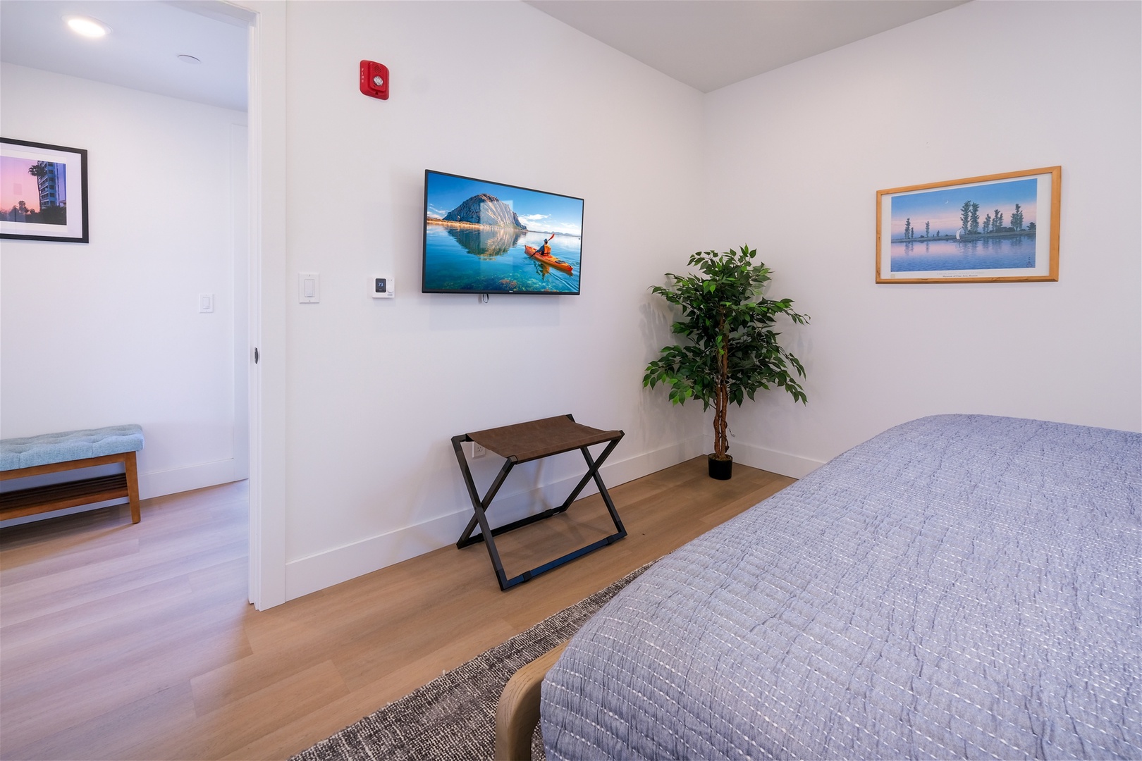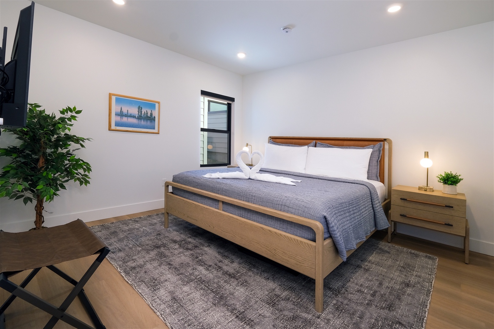 • Spacious bedroom with a luxurious king bed and flat screen TV.