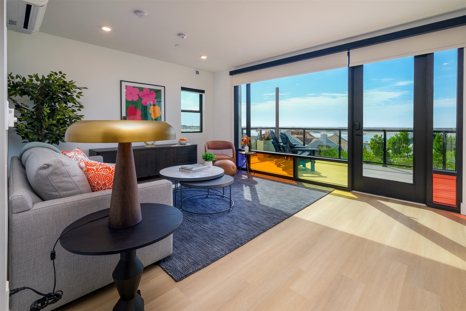 • Large windows in the living area offer views of the bay and harbor from inside.