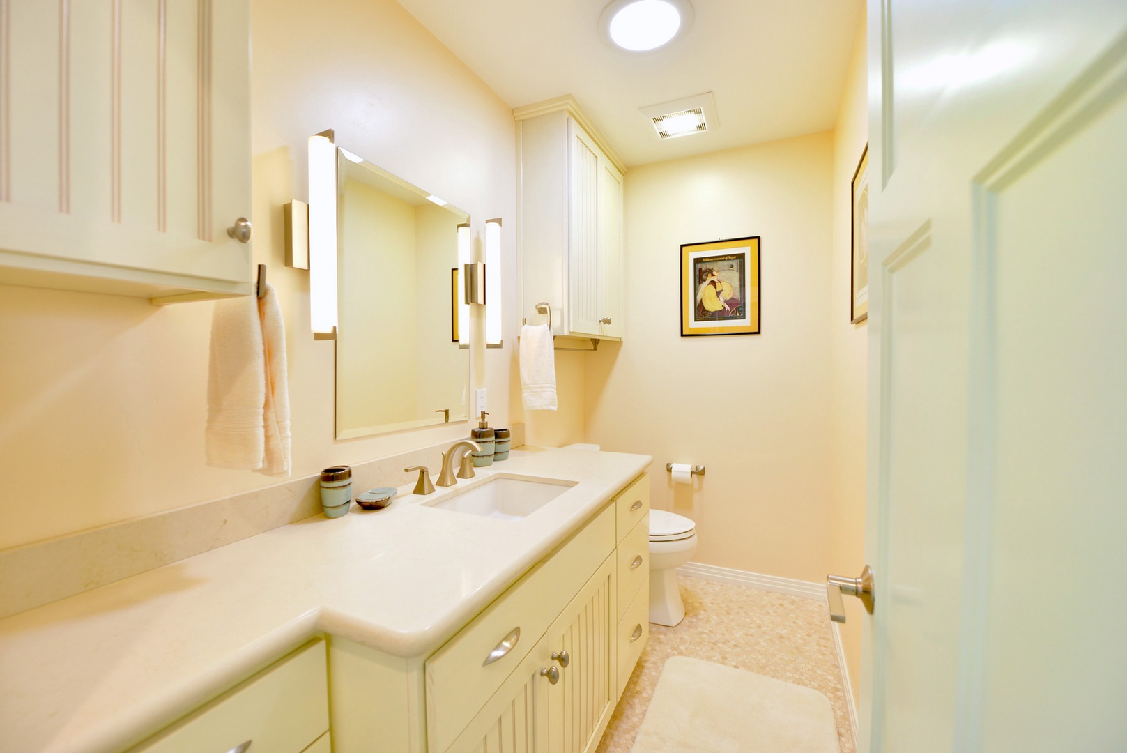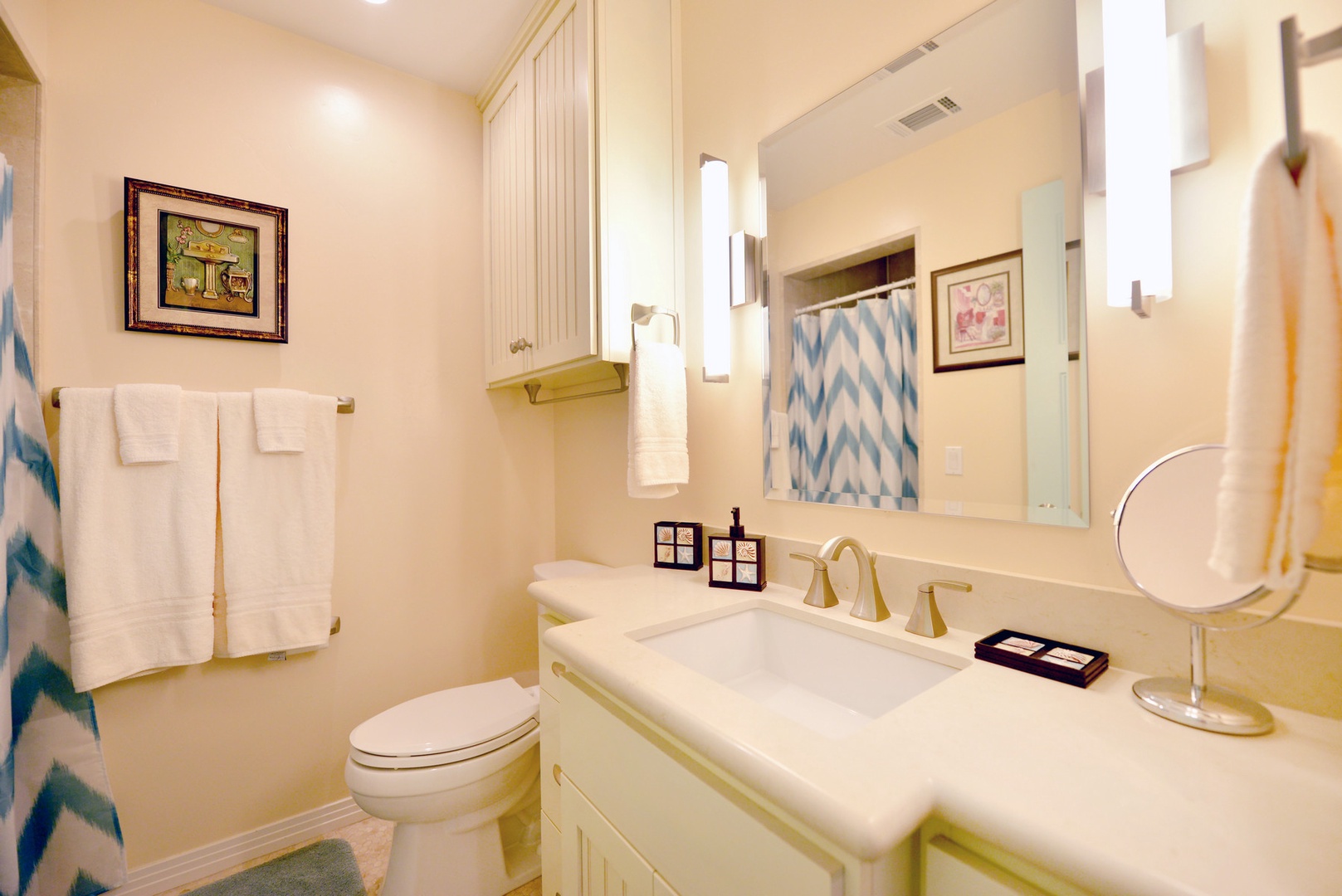 The half bath is easily accessible from the living room and provides an extra place to get ready for your evening out.