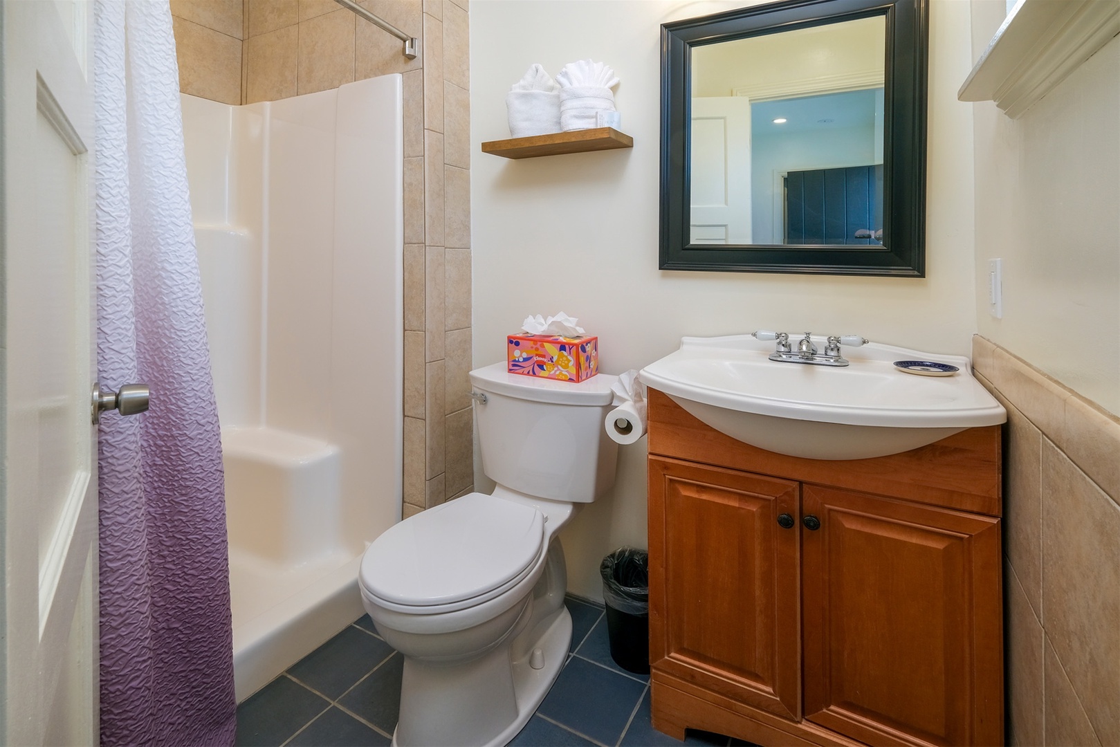 This bathroom is off the living space and has a step in shower