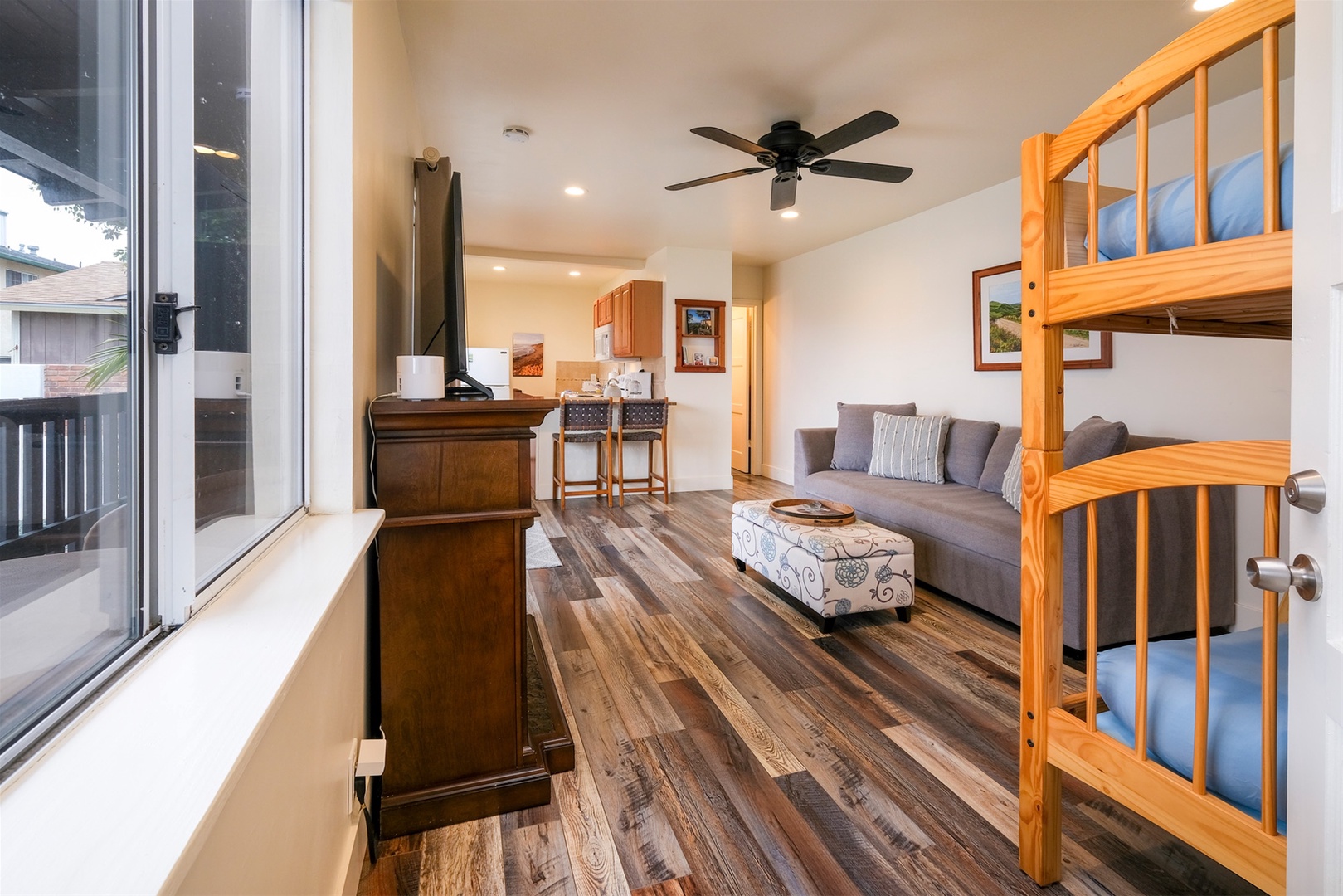 The living room includes a bunk bed and queen pull out sofa bed