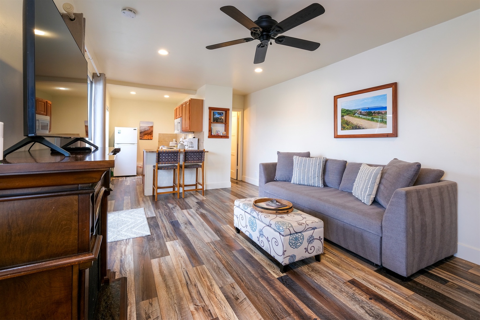 The Sea Gull Bunk Suite is ideal for families, accommodating up to 4 adults or 5 with children. The suite features a cozy bedroom with a queen bed, and the living room includes a queen sleeper sofa and a twin bunk bed. The suite has been fully remodeled and beautifully appointed with new furnishings and a full kitchen. With two full baths, a fully equipped kitchen, and a door for privacy between the living area and bedroom, you’ll have everything you need for a relaxing getaway. It’s the perfect location just steps from downtown Cayucos with access to the beach, restaurants and shops. The suite includes 1 dedicated parking space on site and additional street parking is available.