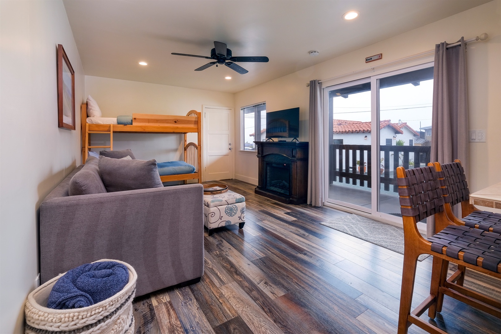 The living area features an electric fireplace, flat screen tv and large sliding glass door to the patio