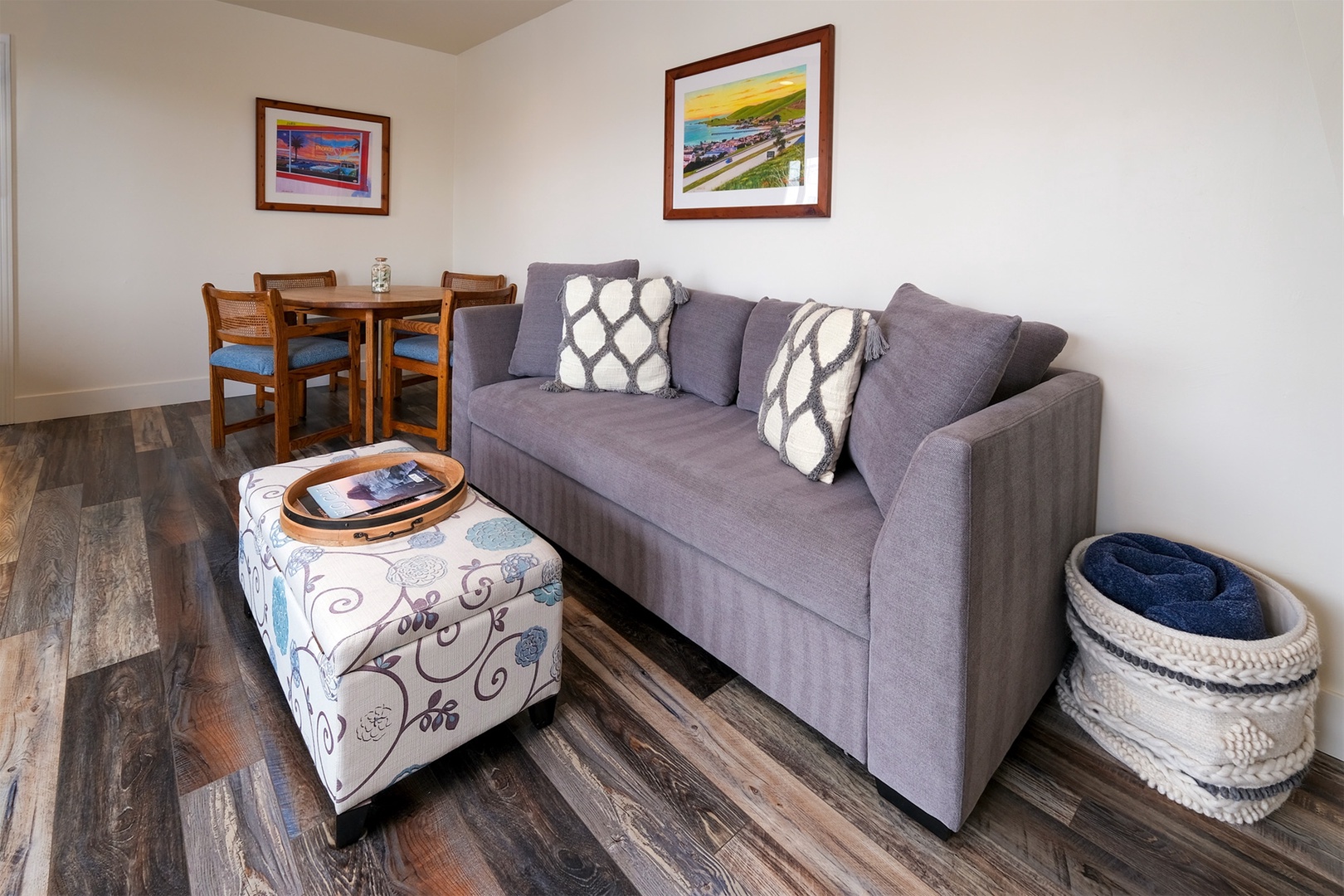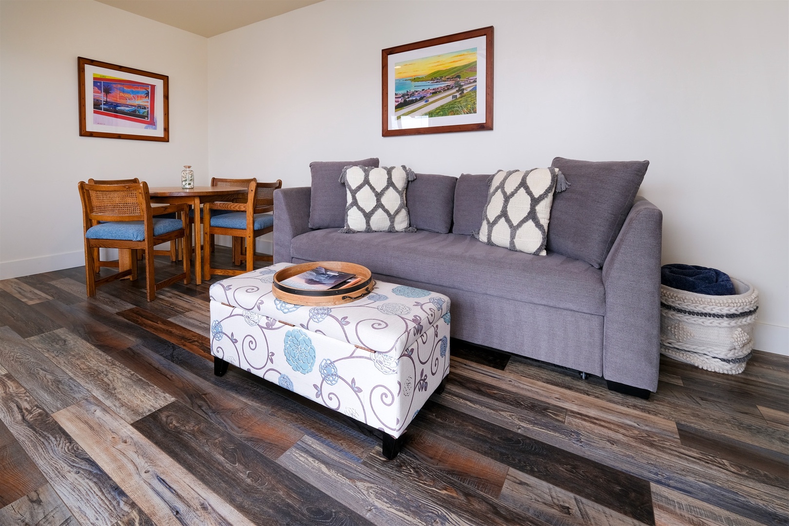 Escape to the Sea Gull Queen Suite, a beautifully remodeled 1-bedroom, 1-bath getaway that comfortably accommodates up to 4 guests. Featuring a bedroom with a queen bed and a living room with a pull-out queen sleeper sofa, this suite is perfect for couples or small families. The suite has been fully remodeled and beautifully appointed with new furnishings and a full kitchen. Nestled just steps from downtown Cayucos, you’ll have easy access to the beach, restaurants, and local shops, making this the ideal location for your next Cayucos getaway. The suite includes 1 dedicated parking space on site and additional street parking is available.